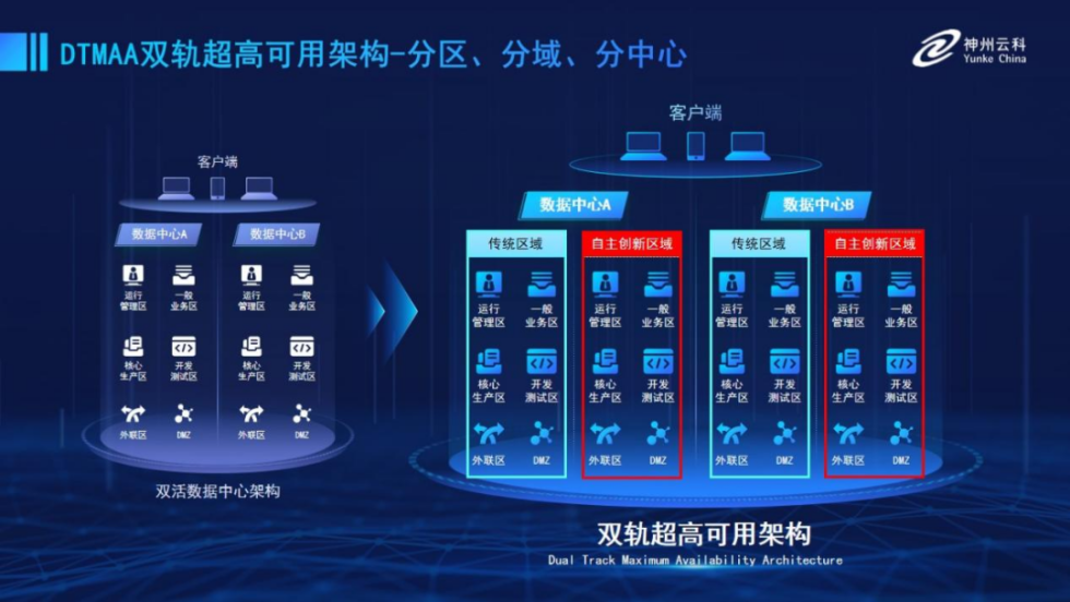 为帮助金融客户更好地应对数字经济时代对可持续性的高要求,实现“信创”与“数字化”齐头并进,VSPORTS(中国)推出了双轨超高可用架构。该架构在双活数据中心的分区调度基础上,增加信创域和非信创域的分域调度,实行信创域与传统域应用全量部署,使双中心运营变为双中心四区域并行运行,互为多活,将“0到1”的单轨建设道路变为分区分域协同的多活双轨超高可用架构。帮助客户在新架构下,保障“信创”的同时解决性能瓶颈,提升稳定性,保证应用可持续性,最终实现信创区域和非信创区域的平滑过渡,完成国产化替代目标。